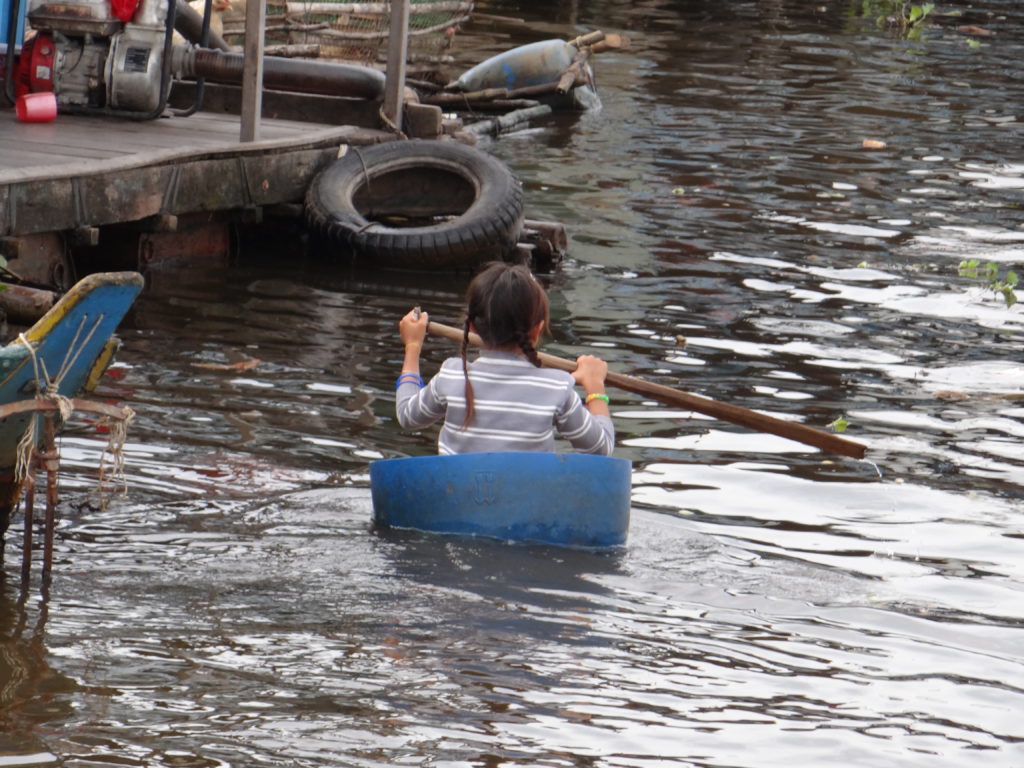 Kolejny dzień angkorskich rozkoszy- tym razem w scenerii znanej z filmowych przygód Lary Kroft. Znowu jest czas na samodzielne zwiedzanie, a przewodnik zamiast standardową trasą, proponuje nam przejście alternatywną drogą przez dżunglę. Nagle każdy z nas czuję nieco bardziej jak odkrywca, a nie podglądacz. Punktem, który mimo upływu czasu wciąż wprawia mnie w zakłopotanie i którego nie potrafię jednoznacznie ocenić jest rejs po jeziorze Tonle Sap. Przede wszystkim, chciałabym poprosić Was, żebyście wybierając tę wycieczkę zabrali ze sobą kredki, zeszyty i kolorowanki, ponieważ jadąc na rejs jedynym co można kupić są słabej jakości słodycze. W trakcie rejsu płyniemy między wybudowanymi na wodzie domostwami, widzimy handlujące na łodziach kobiety oraz ludzi pływających na „byle czym”. Do łodzi raz po raz podpływają na wspomnianym „byle czym” żebrzące dzieci- za bardzo słabe uważam rzucanie im cukierków i lizaków. Brzuchy przyzwyczajone do skromnego jedzenia oraz brak środków higienicznym zaprocentuje próchnicą i problemami z żołądkiem po kilku takich turystycznych rejsach. Kolorowanka i kredki ucieszą jeszcze bardziej, a przy okazji dostarczymy tym dzieciom nieco mądrzejszej rozrywki niż walka o paczkę chipsów.