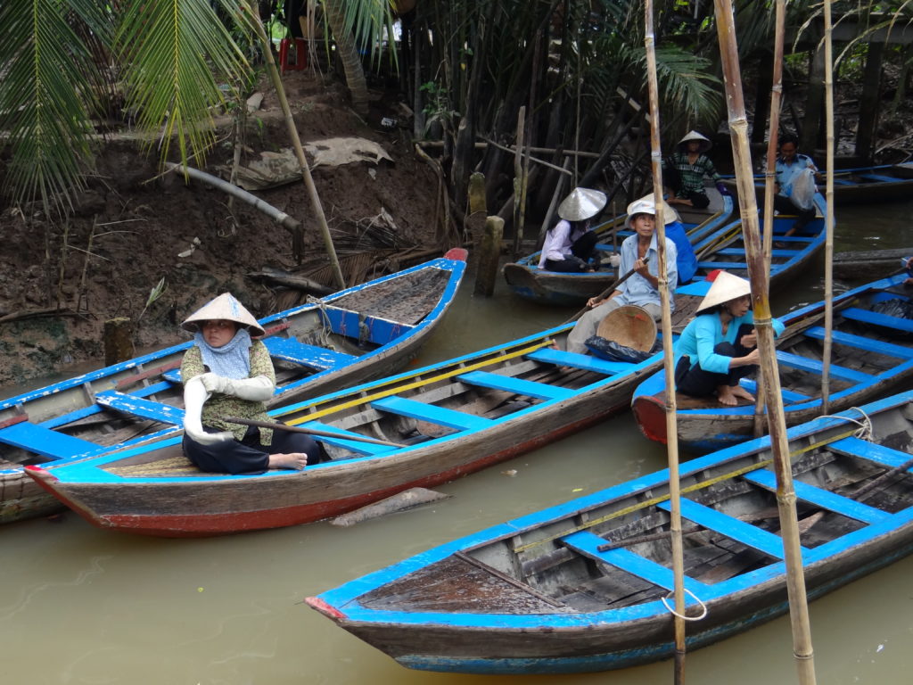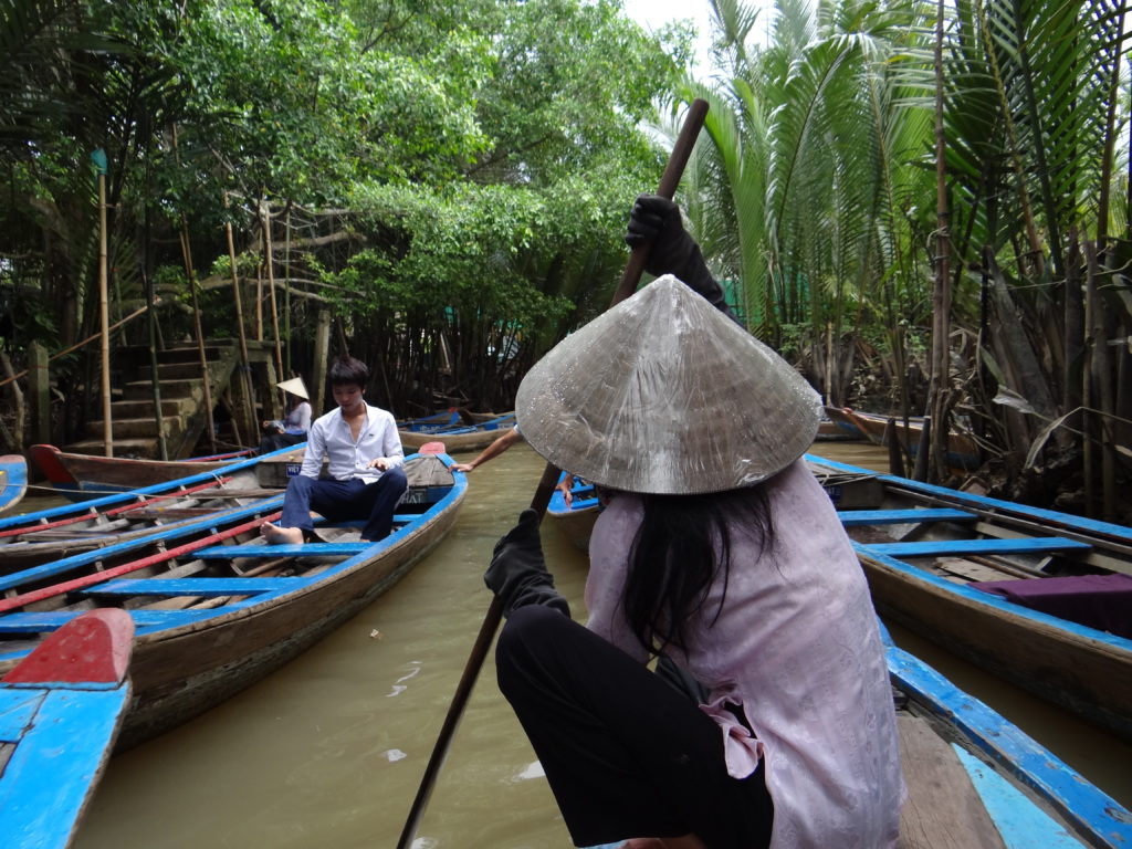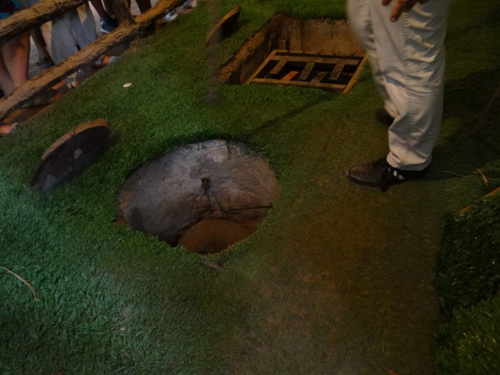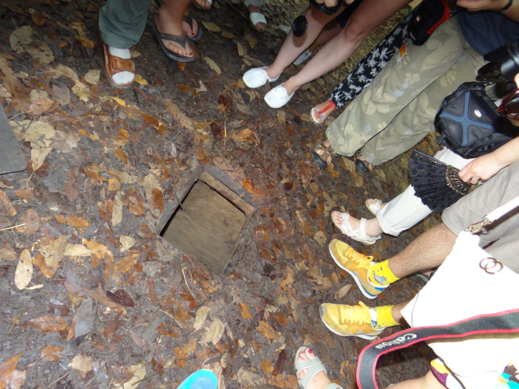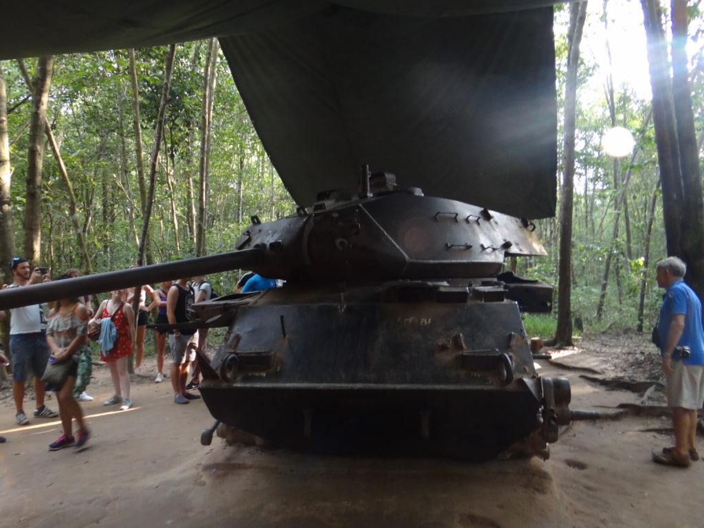 Żegnamy się z Kambodżą i zmierzamy w kierunku granicy z Wietnamem. Kontrola paszportowa oraz wygląd przejścia granicznego uświadamia nam, że wjeżdżamy do innej czasoprzestrzeni. Wszystko jest bardziej zorganizowane i do ogarnięcia dla naszych europejskich umysłów. Jedziemy do słynnych tuneli Cu Chi– wylewając się na parking z autobusu każdy ma wrażenie, że oto właśnie znalazł się na planie filmu o wojnie w Wietnamie. Kompleks tuneli to dzisiaj wojskowy park rozrywki. Z jednej strony możemy zobaczyć, jak wyglądały kulisy wojny- bieganie po dżungli, w której wilgotność powietrza graniczy z przebijaniem się przez ścianę wody, naszpikowanej zmyślnymi pułapkami nastawionymi nie na zabicie lecz zadanie maksymalnego bólu przeciwnikowi. A to wszystko w pakiecie z możliwością postrzelania z kałasza oraz uwieszeniem się na lufie czołgu. Zapomniałabym- w międzyczasie można obejrzeć film propagandowy.